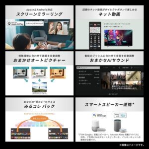 おまかせオートピクチャー: 部屋の明るさやコンテンツ種類をリアルタイム検知し、明るさ・色・コントラストを自動最適化。設定不要で常に見やすい画質へ調整される。