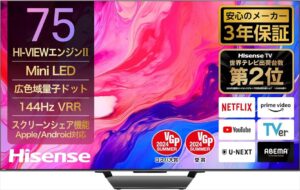 ハイセンスの75U8Nは、最新技術を駆使した75インチの4K液晶テレビで、Mini LEDと量子ドット技術を採用し、映像美と多機能性を兼ね備えています。以下に、その機能や特徴を詳しく解説します。