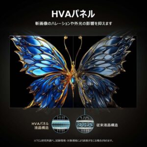 55T6C は VAパネル を採用しており、IPSよりも黒の沈み込みが深く、映画鑑賞に向いた高コントラスト映像を実現します。