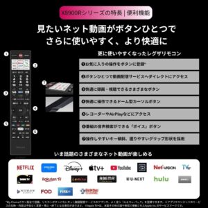 55X8900Rは、YouTube・Netflix・Prime Video・Disney+・U-NEXT・TVer など主要なネット動画サービスに幅広く対応しています。