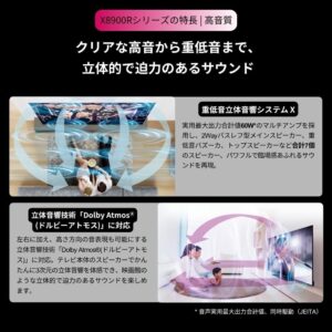ネット動画では ネット動画ビューティPRO や バンディングスムーサーPRO がノイズを抑え、配信映像をより自然で美しい画質に補正します。音響面では 重低音立体音響システムX と Dolby Atmos に対応し、内蔵スピーカーでも立体的で迫力あるサウンドを楽しめる点が特徴です。