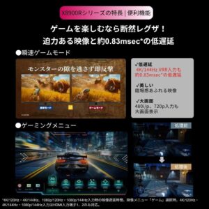 スポーツやアクションの動きに強く、ゲーム用途でも遅延・カクつきの少ない表示が可能。