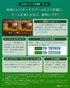 最新のHDMI 2.1フル機能(4K/120Hz入力、VRRなど)は上位モデルほど強くありません。