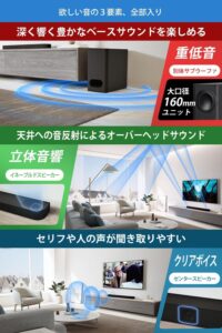 合計出力は350Wで、映画やライブ映像の迫力が大幅に向上。