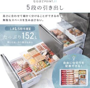 アイリスオーヤマ IRSN‑SX43A‑Hは、大容量152Lの5段冷凍室