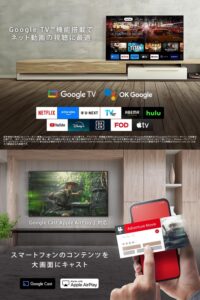 Chromecast built‑in に対応し、スマホのYouTubeや写真・動画をワンタップでテレビに表示できます。