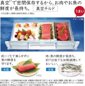 冷蔵室内の専用スペース(真空チルドルーム)を 小型真空ポンプで減圧し、約0.8気圧の真空環境 にする機能です。