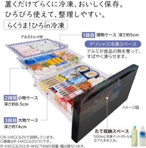 R‑WXC74W の冷凍室は 212L の大容量で、下段冷凍室が「3段ケース構造」になっています。