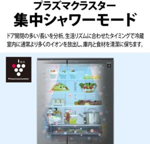 冷蔵室内にシャープ独自の「プラズマクラスターイオン」を放出し、庫内に浮遊・付着する菌を抑制することで、清潔な庫内環境を維持しやすくしています。